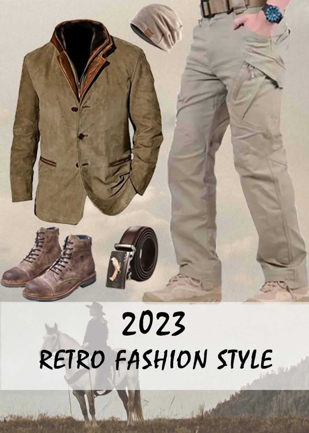 Men Vintage Stand Collar Suede Blazer Side Zip Fly Contrast Leather Webbing Medium Length Jacket Coats-23329